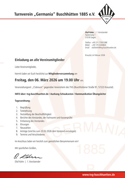der Vorstand des TV Germania Buschhütten, lädt euch fristgerecht, zur Mitgliederversammlung ein.